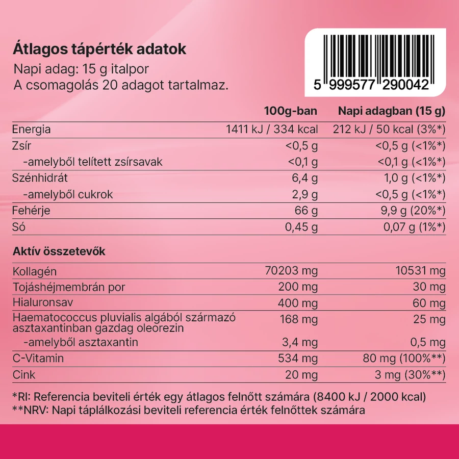 Kollagén komplex [hidrolizált marhakollagén (I-es típusú), tojáshéjmembrán por (35% kollagén tartalommal – I, V és X-es típus), csirkekollagén (II-es típusú)], élelmi rost (inulin), aroma, málnapor, étkezési sav (citromsav), színező élelmiszer (céklakoncentrátum), liofilizált málnadarabok, C-vitamin (L-aszkorbinsav), hialuronsav (nátrium-hialuronát), édesítőszer (szukralóz), Haematococcus pluvialis algából származó asztaxantinban gazdag oleorezin*, cink (cink-biszglicinát), színezék (kurkumin).
