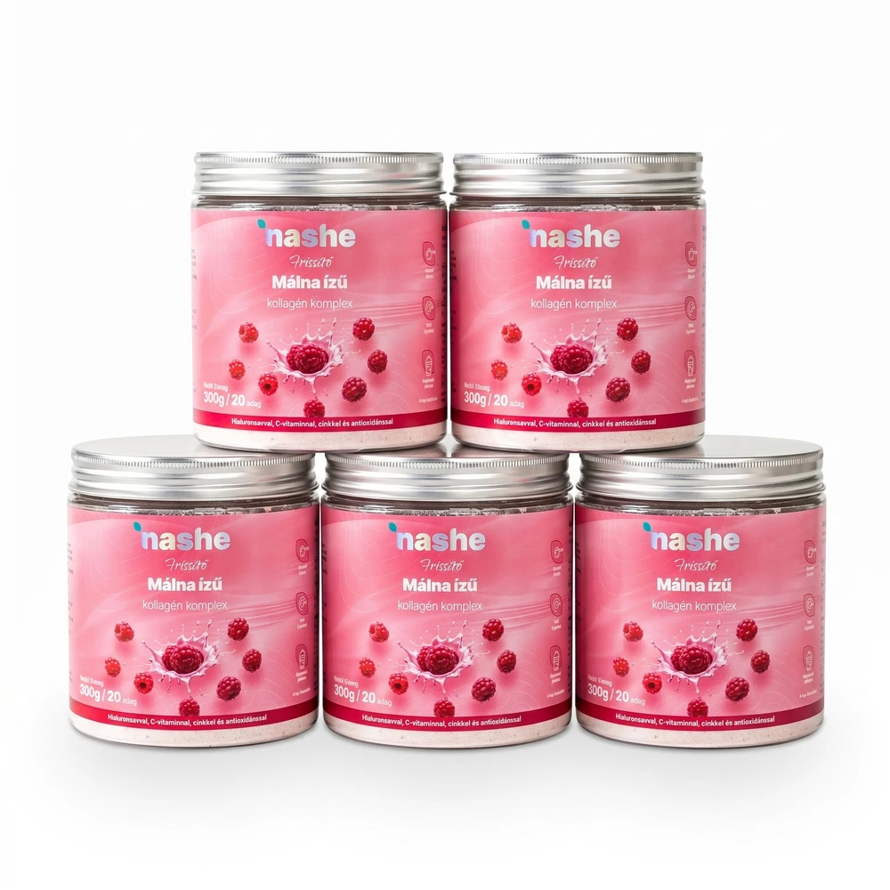 A Nashe Málna Megújulás a tökéletes választás azoknak, akik elkötelezik magukat a következetes szépséggondozás mellett. 5 doboz málna ízű kollagén komplex, összesen 100 napi adag - minden, ami kell egy teljes körű, több hónapos kollagénkúrához. Ráadásul jóval kedvezőbb áron, mint ha a dobozokat egyenként vásárolnád meg.