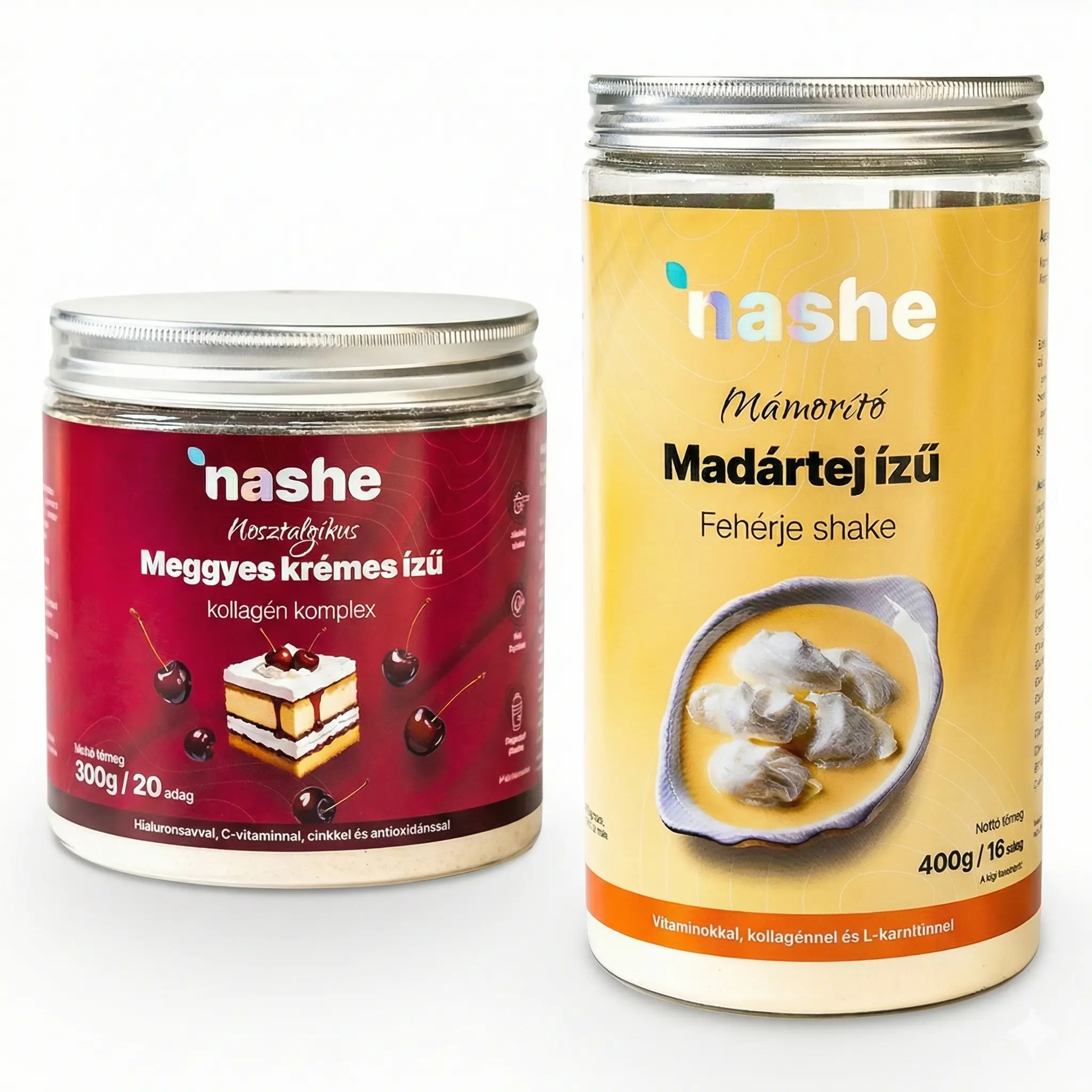 A Nashe Ragyogás & Erő csomag két terméket párosít, amelyek egymást kiegészítve támogatják a szervezetet: a Meggyes krémes kollagén a bőr, haj és ízületek egészségéért dolgozik, a Madártej ízű fehérje shake pedig az izmok regenerációját és az aktív életmódot segíti.